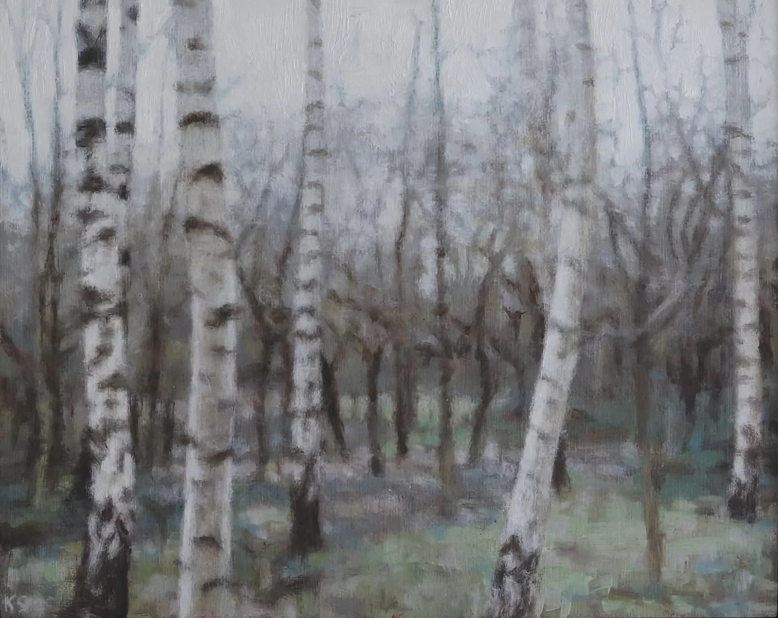 Various themes run through much of Sherman’s work such as memory, longing and transience. There are often recurring subjects: blossom; forests and woodland; dwellings, which are sometimes blurred as if seen from a moving vehicle. The imagery originates from photographs she has taken of her surrounding landscape. This photographic source is important because the paintings capture a reflective notion of memory, of the emotional distance between a real landscape and a photograph, between experience and longing. The work has a poignancy that often mediates warm familiarity with a sense of foreboding. There is also a quiet melancholy, reminiscent of Edward Hopper, that is expressed both by the portrayal of sparse unpopulated landscapes containing elemental traces of man, and by the restrained palette suffused in a reserved northern European light.
