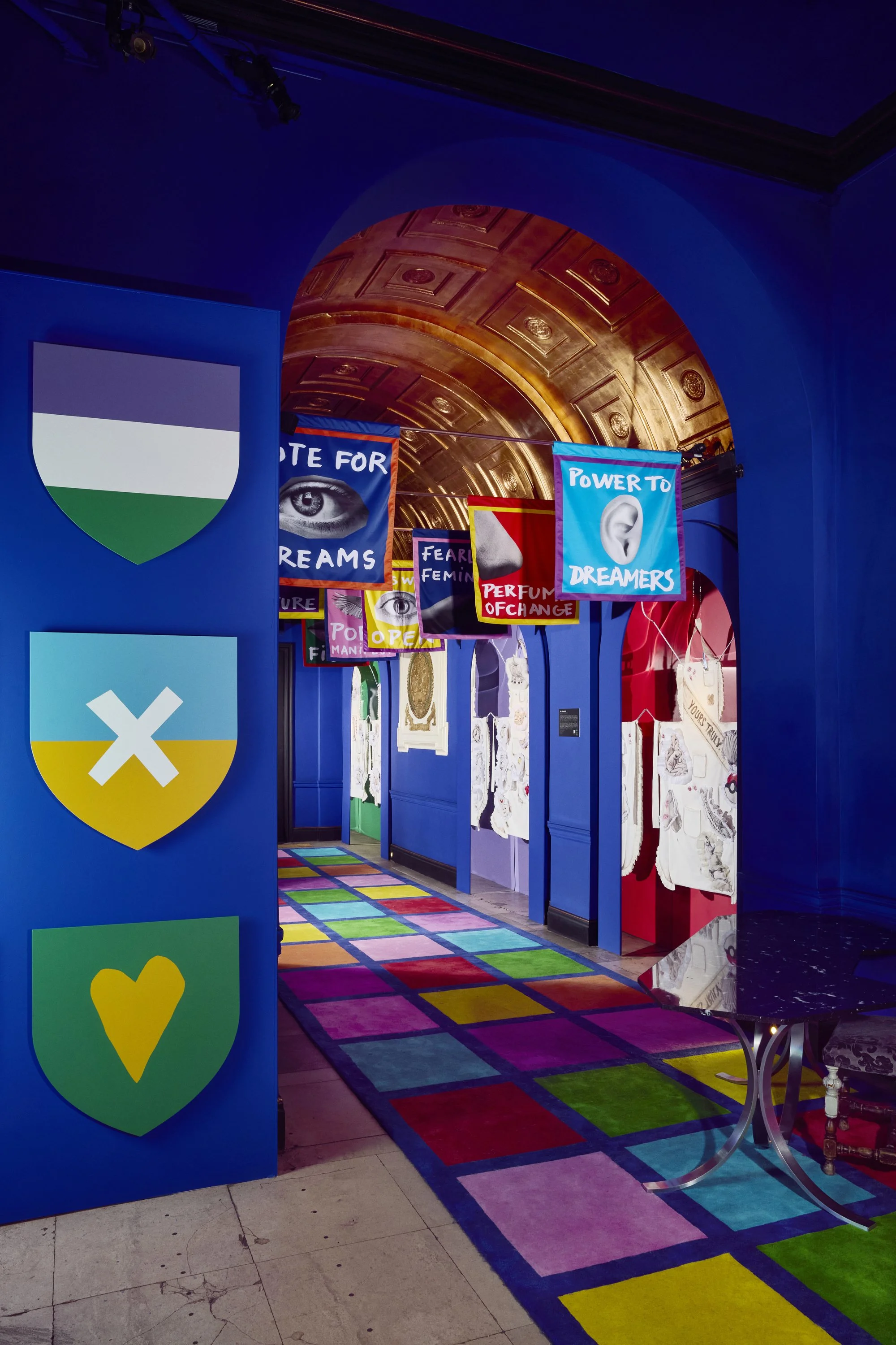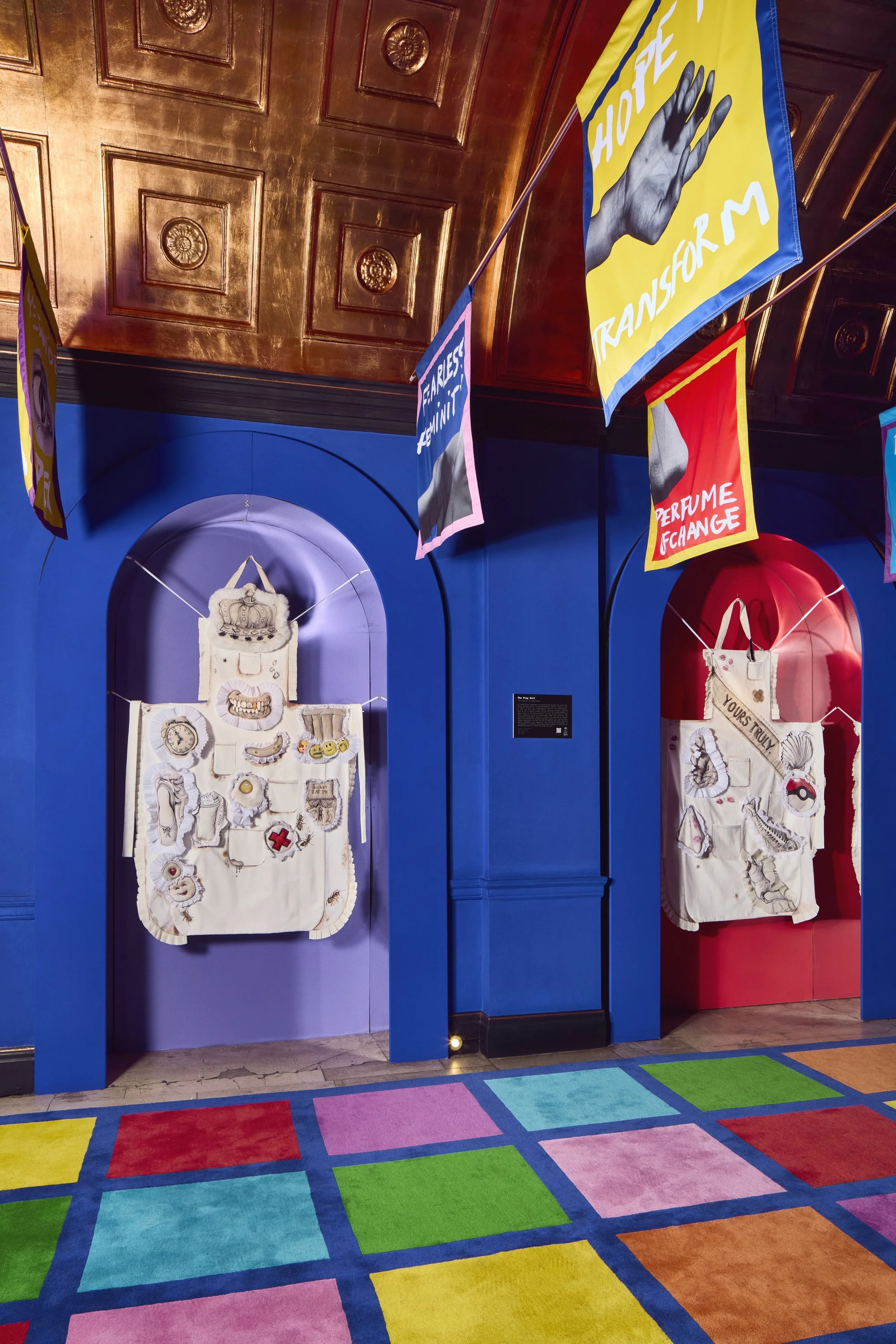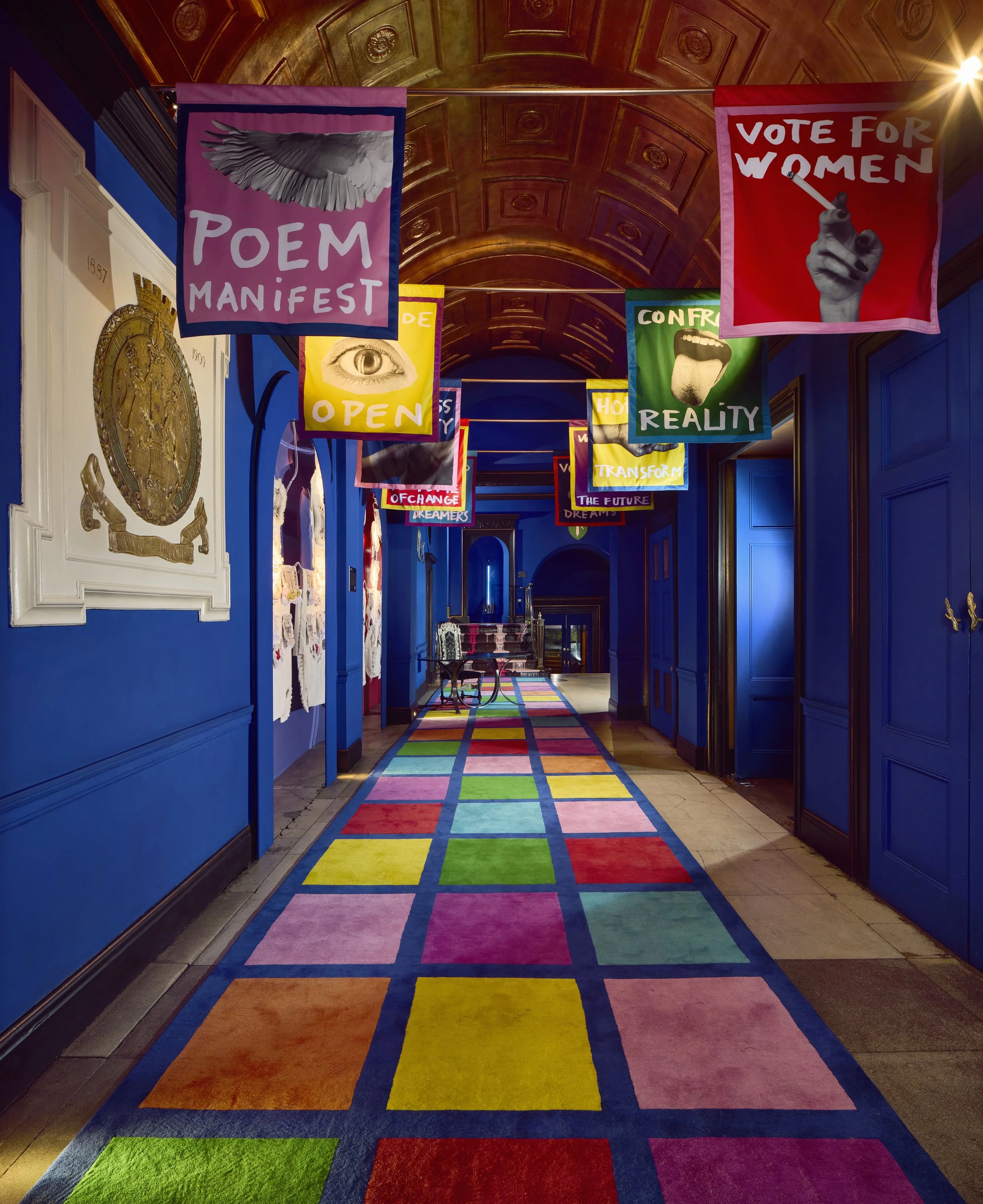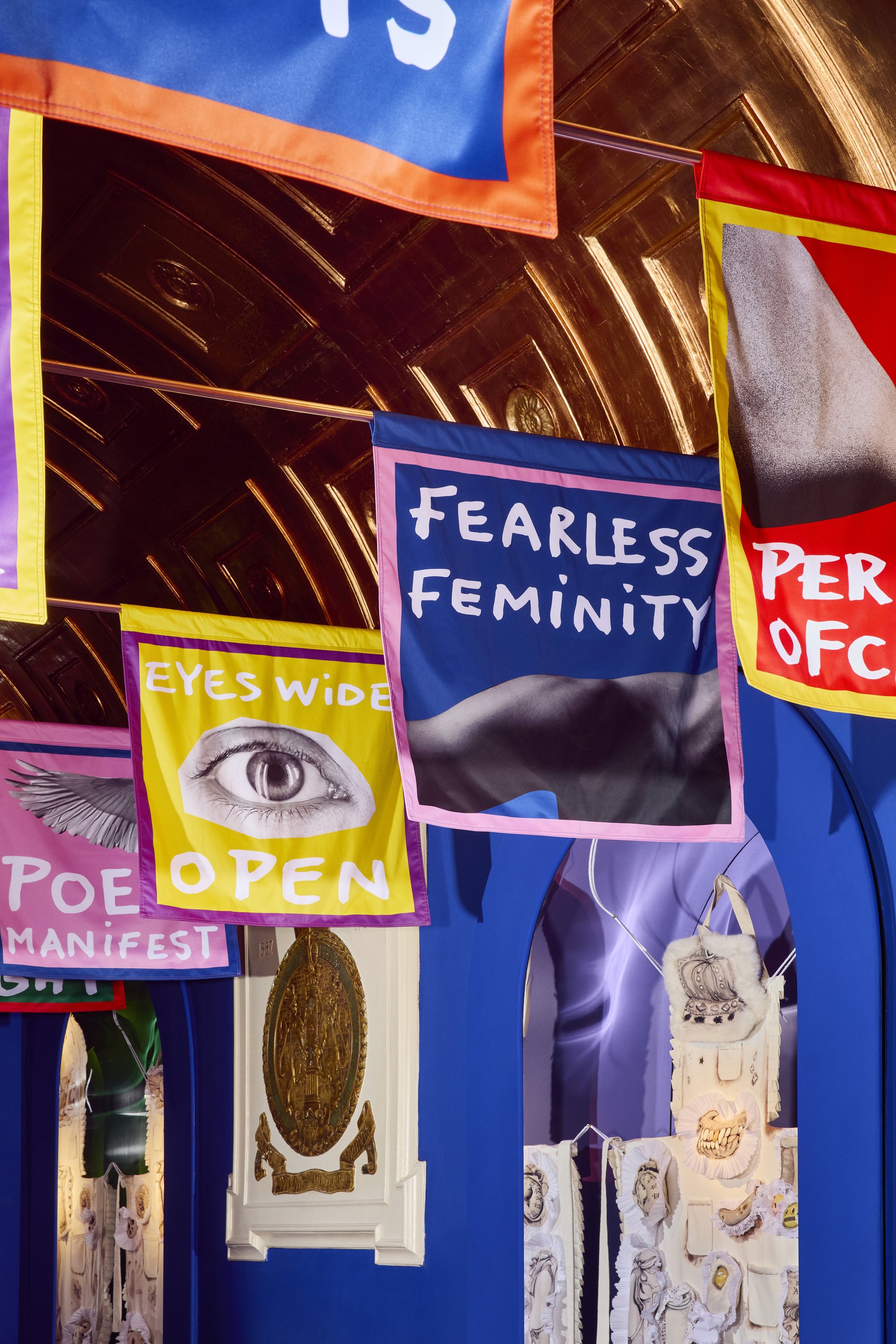 Home of the Braves celebrates the pioneering courage and unapologetically fearless spirit of the Suffragettes. Imagined by Jean-Charles de Castelbajac, the installation channels his unmistakable visual language, a disciplined palette of blue, yellow, and red, and a multidisciplinary approach that merges art, fashion, and graphic expression. Castelbajac invited Ida Immendorff to reinterpret elements of protest and the historic suffragette apron, resulting in bespoke garments that dress the three alcoves and expand the installation’s narrative. Together, their collaboration transforms the space into a vibrant, modern homage to activism, unity, and creative resistance.