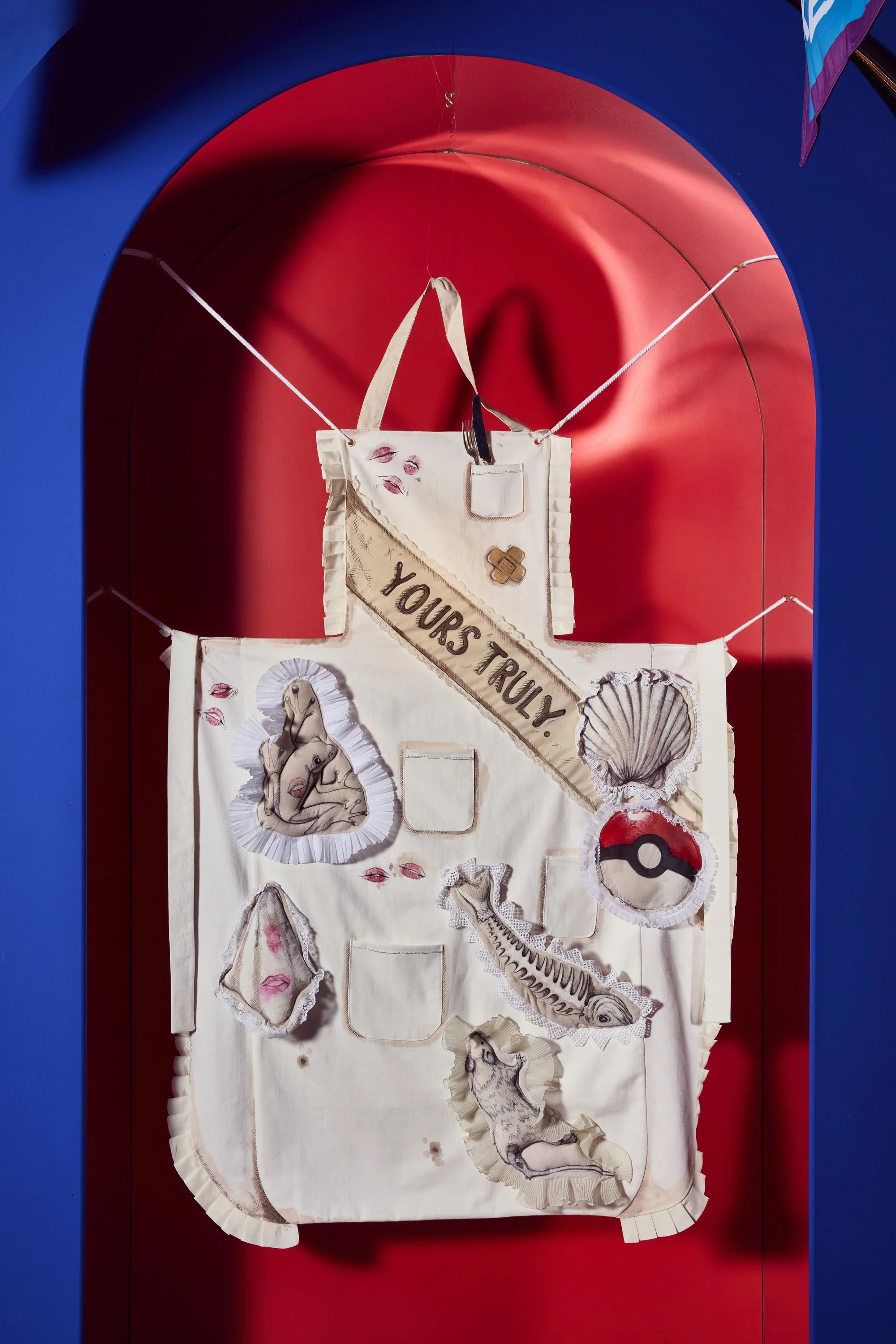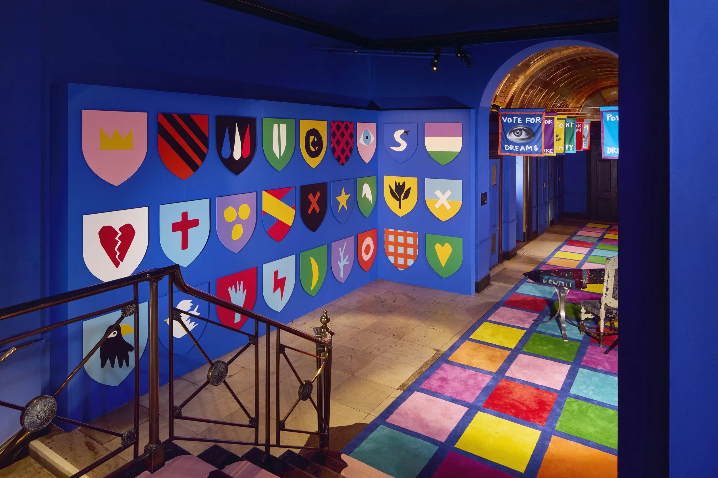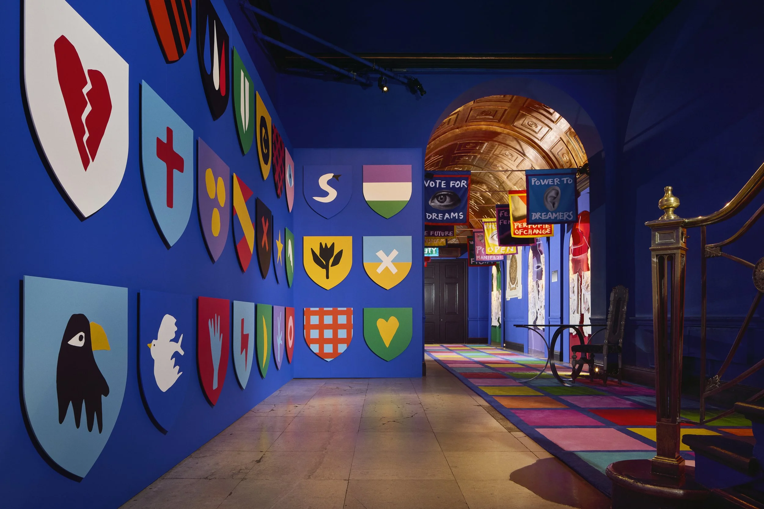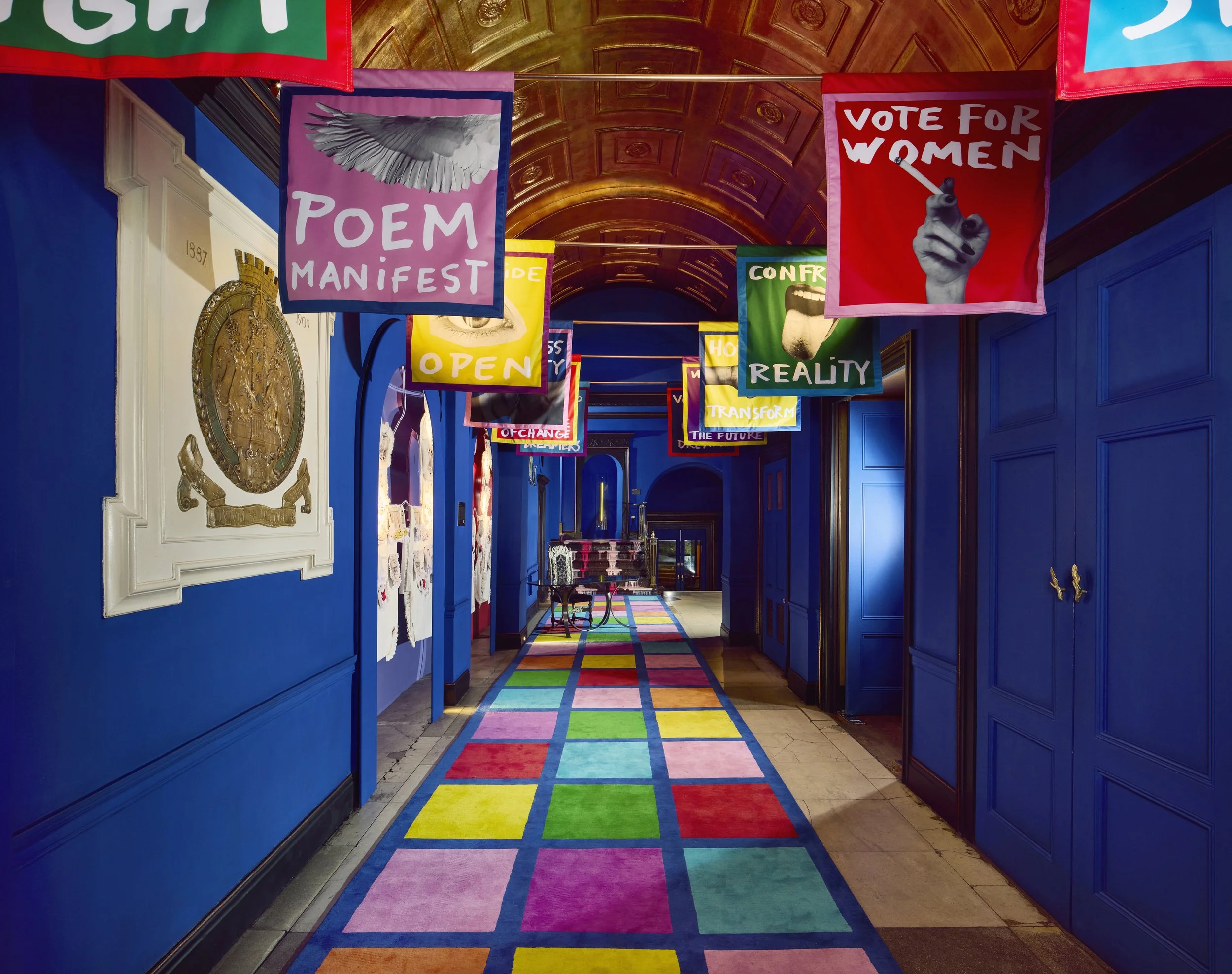 Home of the Braves celebrates the pioneering courage and unapologetically fearless spirit of the Suffragettes. Imagined by Jean-Charles de Castelbajac, the installation channels his unmistakable visual language, a disciplined palette of blue, yellow, and red, and a multidisciplinary approach that merges art, fashion, and graphic expression. Castelbajac invited Ida Immendorff to reinterpret elements of protest and the historic suffragette apron, resulting in bespoke garments that dress the three alcoves and expand the installation’s narrative. Together, their collaboration transforms the space into a vibrant, modern homage to activism, unity, and creative resistance.