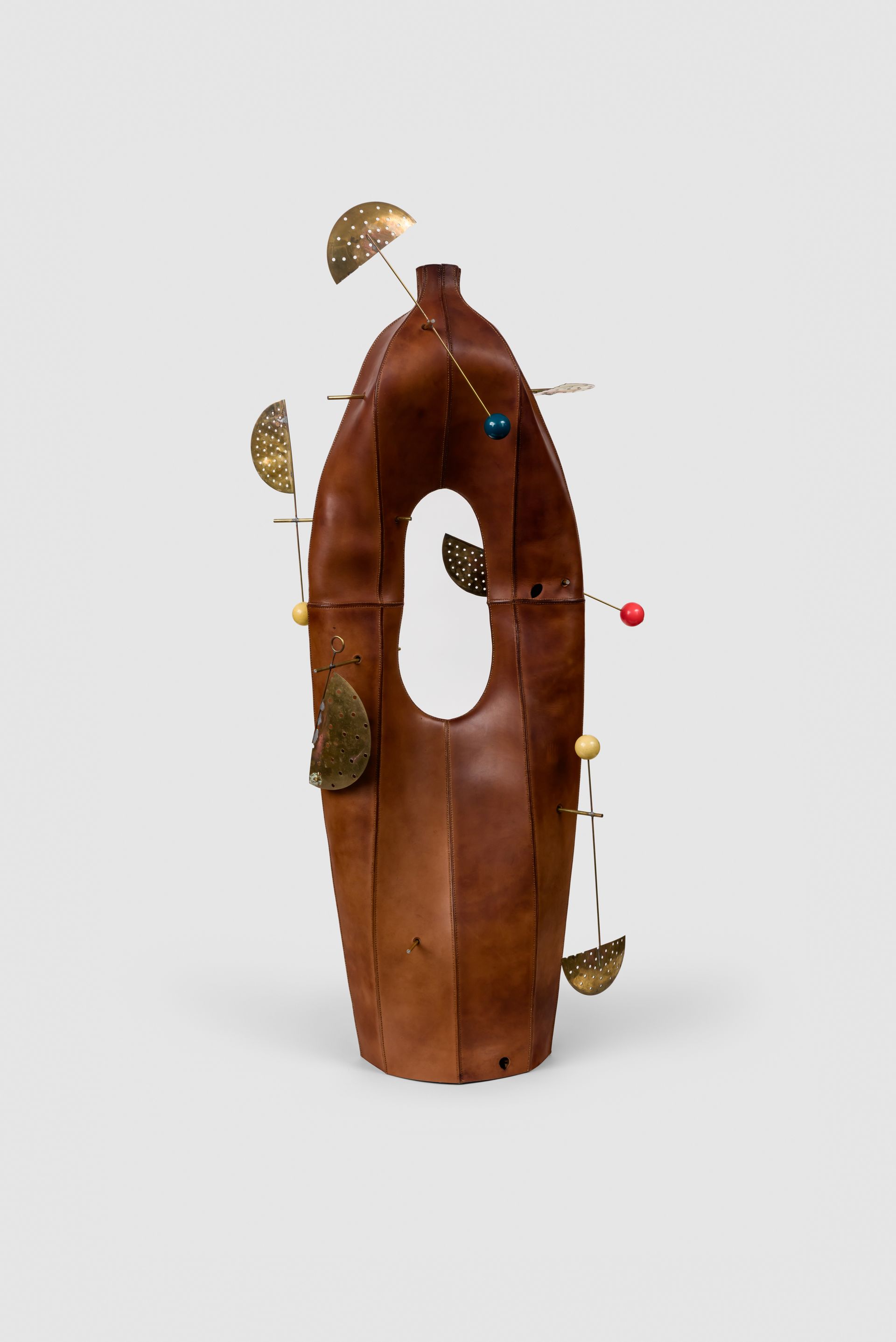 Pinnock’s intricate leather and mixed media sculptures function as vignettes: each piece a distilled dreamscape, shaped by narrative, memory, and the rhythm of recurring thought. Her sculptures are worlds unto themselves. They recall the bespoke techniques of garment, puppet, and shoemaking, adorned with curious attachments that orbit, hang, pierce, or rest upon the forms, charging their presence as suggestive, uncanny characters.